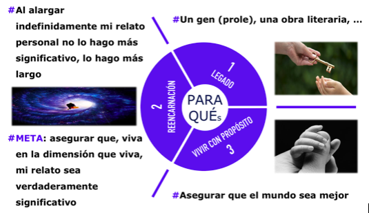 La segunda alternativa, tan válida como la anterior, podría estar conectada con la creencia en la reencarnación. Si fuera así deberíamos pensar que al alargar indefinidamente nuestros respectivos relatos personales no los hacemos más significativos, los hacemos más largos, nada más. Personalmente considero que la meta de cualquier individuo es asegurar que, viva en la dimensión que viva, su RELATO PERSONAL sea verdaderamente SIGNIFICATIVO