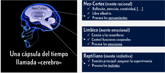 El cerebro humano es una especie de cápsula del tiempo que ilustra el desarrollo evolutivo del hombre. Se puede decir que el curso completo de nuestra evolución se esconde bajo nuestro cráneo. El modelo que voy a presentar a continuación fue formulado por Paul MacLean en la década de los años sesenta del siglo pasado.