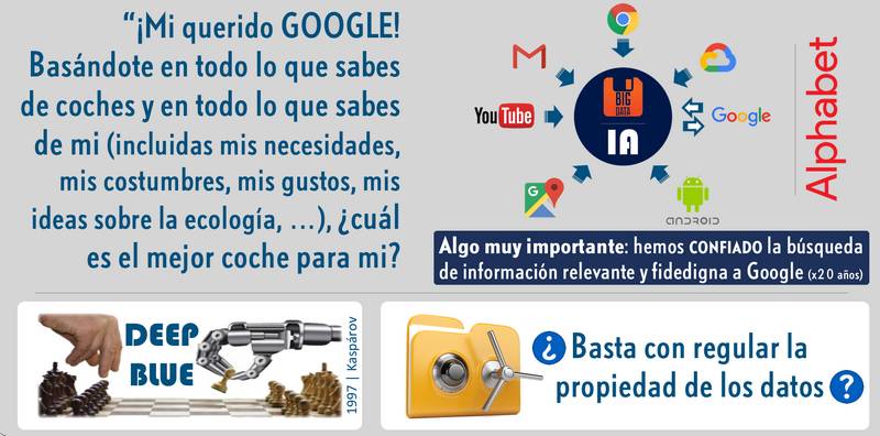 Ubiquémonos en 2030 y en un momento dado yo le formulo la siguiente pregunta a Google: “Mi querido Google, basándote en todo lo que sabes de coches y en todo lo que sabes de mí (incluidas mis necesidades, mis preferencias, mis gustos, mis ideas sobre la ecología…), ¿cuál es el mejor coche para mí?” – ¿Qué pasará el día en el que me deje guiar por Google hasta ese nivel? Algo muy simple: ¡MI IDENTIDAD COMO CIUDADANO GLOBAL ESTARÁ EN RIESGO!